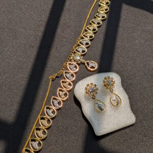Shop Anoira gold plated American Diamond necklace set for women. Elegant CZ teardrop necklace with earrings—perfect for wedding, party & festive wear.