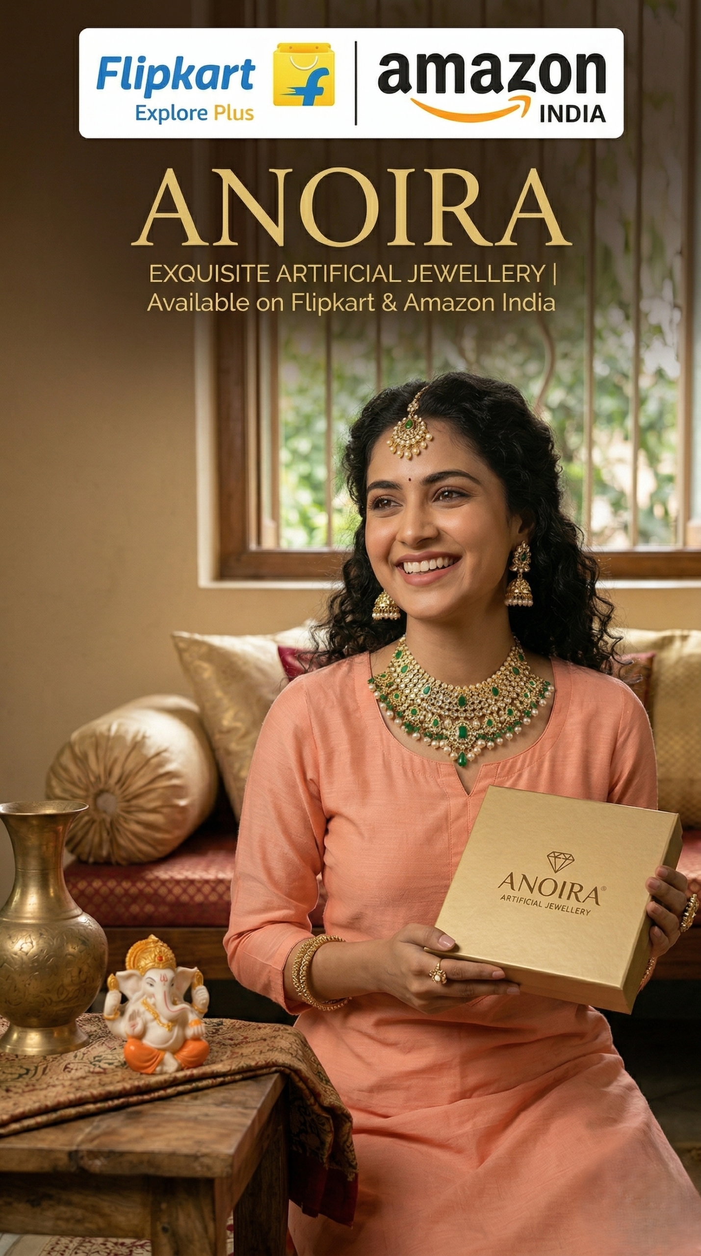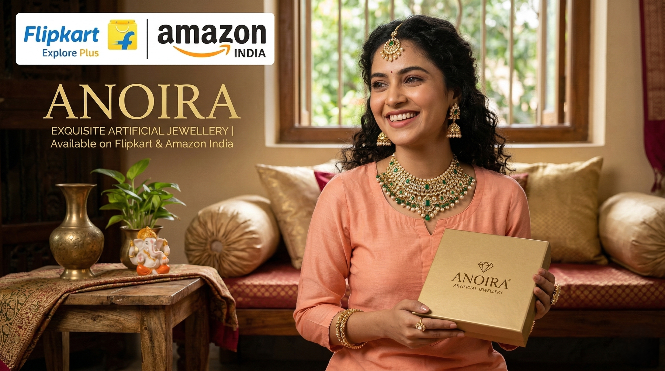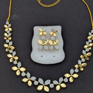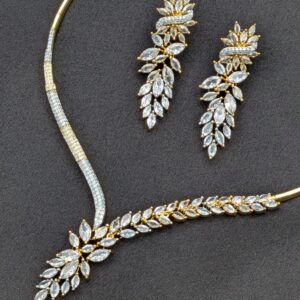 Shop Anoira gold plated American Diamond necklace set for women. Elegant leaf design CZ necklace with earrings—perfect for party, wedding & festive wear.