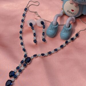 Shop Anoira American diamond necklace set with blue stones, designer zig zag CZ AD necklace with dangler earrings for wedding, party & festive wear.