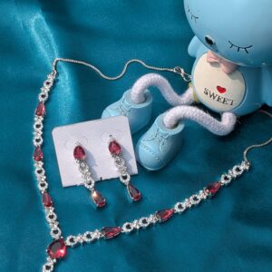 Anoira Ruby Red American Diamond Necklace Set for Women – Luxury Silver Toned AD Jewelry with Teardrop Pendant & Dangler Earrings | Bridal Wedding Party Wear Designer Necklace