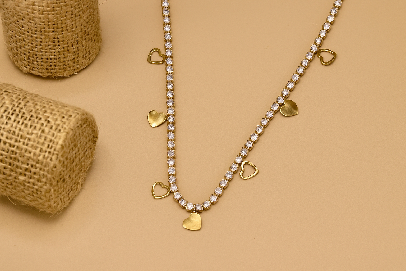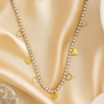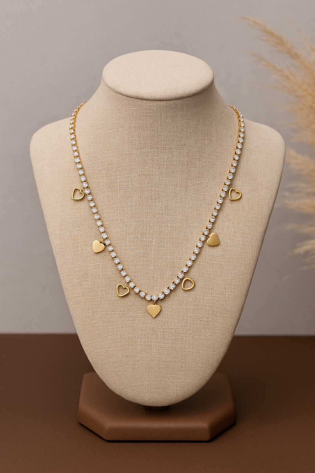 The necklace lies beautifully on the neckline, offering a lightweight, comfortable fit suitable for daily styling. Whether paired with western outfits, traditional attire, office wear, or party wear, the shimmering AD stones and delicate gold hearts make it a versatile fashion jewellery piece. It captures the trending jewellery themes of minimalist necklaces, charm necklaces, layered jewellery looks, romantic heart jewellery, and celebrity-inspired diamond tennis chains.
