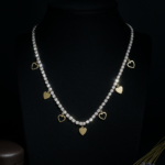 Enhancing the necklace’s charm are multiple gold-toned heart pendants, positioned thoughtfully along the chain. These hearts come in two designs: solid gold-plated heart charms and minimal open-heart charms, both adding a romantic, youthful, and elegant aesthetic. The combination of shimmering AD stones with dainty gold hearts creates a premium designer jewellery look, making it a trending choice for women seeking everyday wear necklaces, gifting jewellery, Valentine’s jewellery, anniversary accessories, and modern festive jewellery.