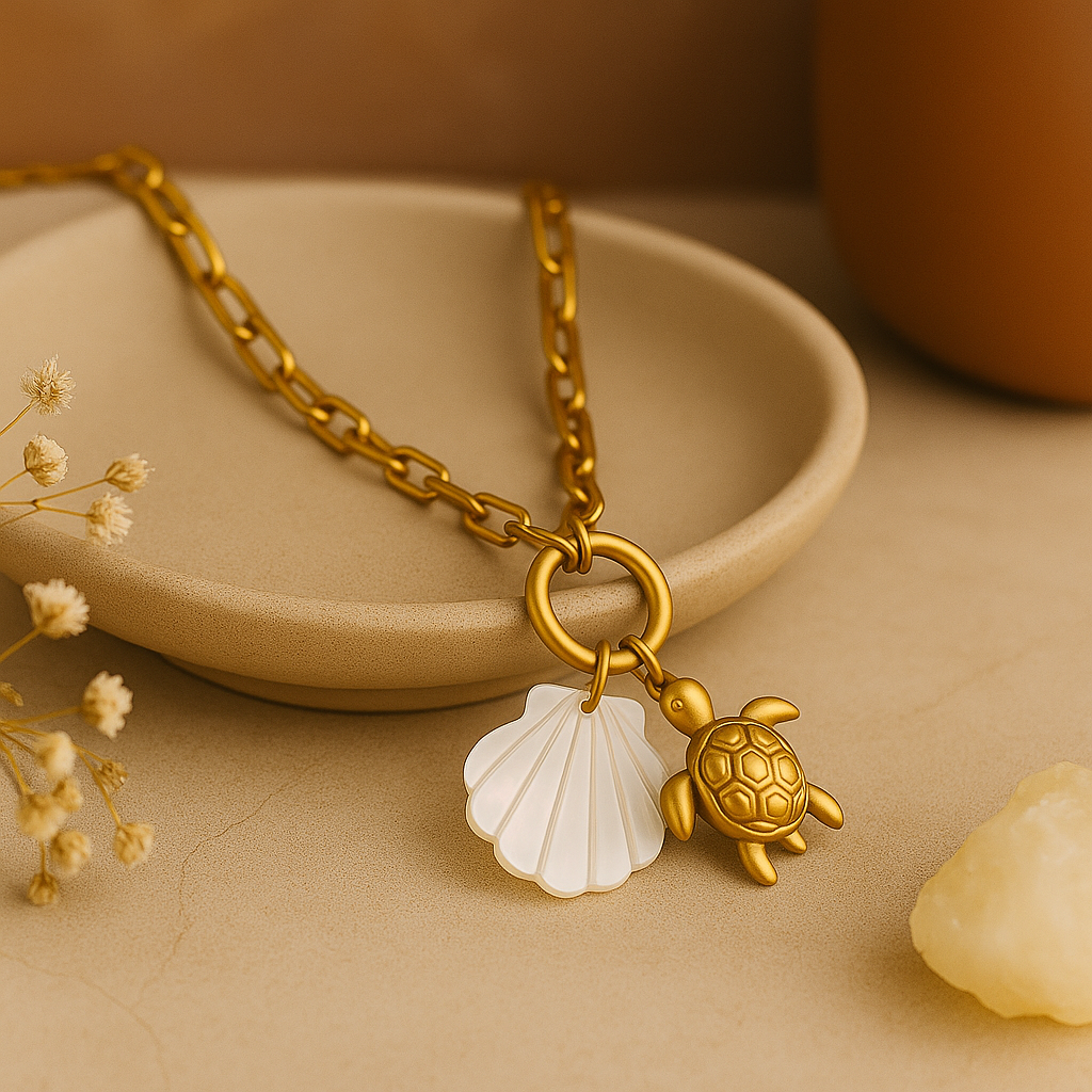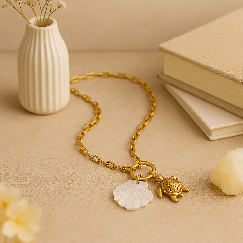 This piece is especially popular among those searching for trendy charm necklaces, aesthetic gold jewellery, Korean-style jewellery, and lightweight artificial jewellery for everyday use. Its versatile design makes it suitable for gifting, vacation outfits, summer fashion, and daily minimalist looks. The turtle and shell combo also ties into spiritual and emotional keywords such as symbolic jewellery, protective talisman necklaces, and meaningful pendant chains.
