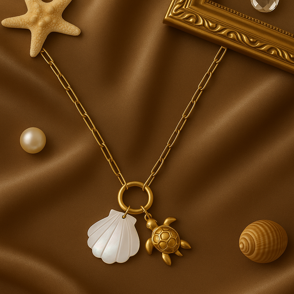 Attached to the ring is a beautifully carved mother-of-pearl shell charm, displaying soft iridescent hues that catch the light with a natural, pearly glow. This charm highlights trending themes like sea-inspired jewellery, coastal charm necklaces, and shell pendant jewellery. Next to it rests a meticulously detailed gold turtle charm, adding a touch of whimsy and symbolism that aligns with popular searches like turtle jewellery for women, ocean animal pendants, and good-luck charm necklaces. Together, the pendants create a harmonious marine vibe ideal for lovers of nautical jewellery, beach vacation accessories, and ocean-themed fashion pieces.