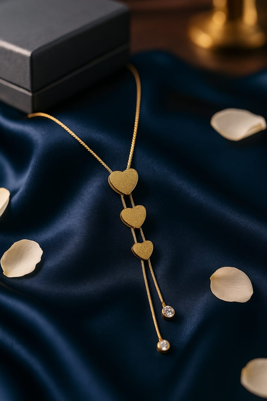 Elegant, modern and unmistakably romantic — the Anoira Anti-Tarnish Heart Lariat Necklace blends minimalist luxury with everyday durability. This gold-tone Y-style necklace features three micro-textured heart motifs stacked vertically along a slender, anti-tarnish chain, finished with two delicate drop chains that each terminate in bezel-set clear stones for a subtle, eye-catching sparkle. Designed to keep its warm, polished look wear after wear, the piece reads both as a statement pendant and a perfectly dainty layering piece.