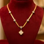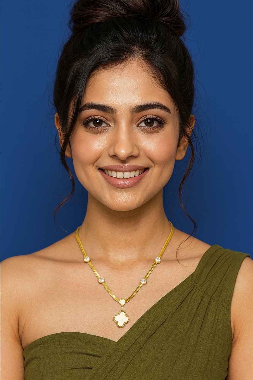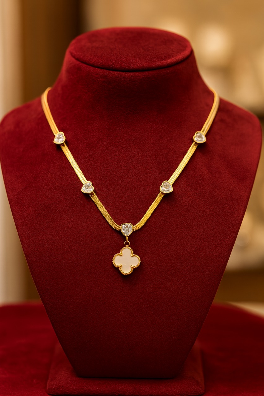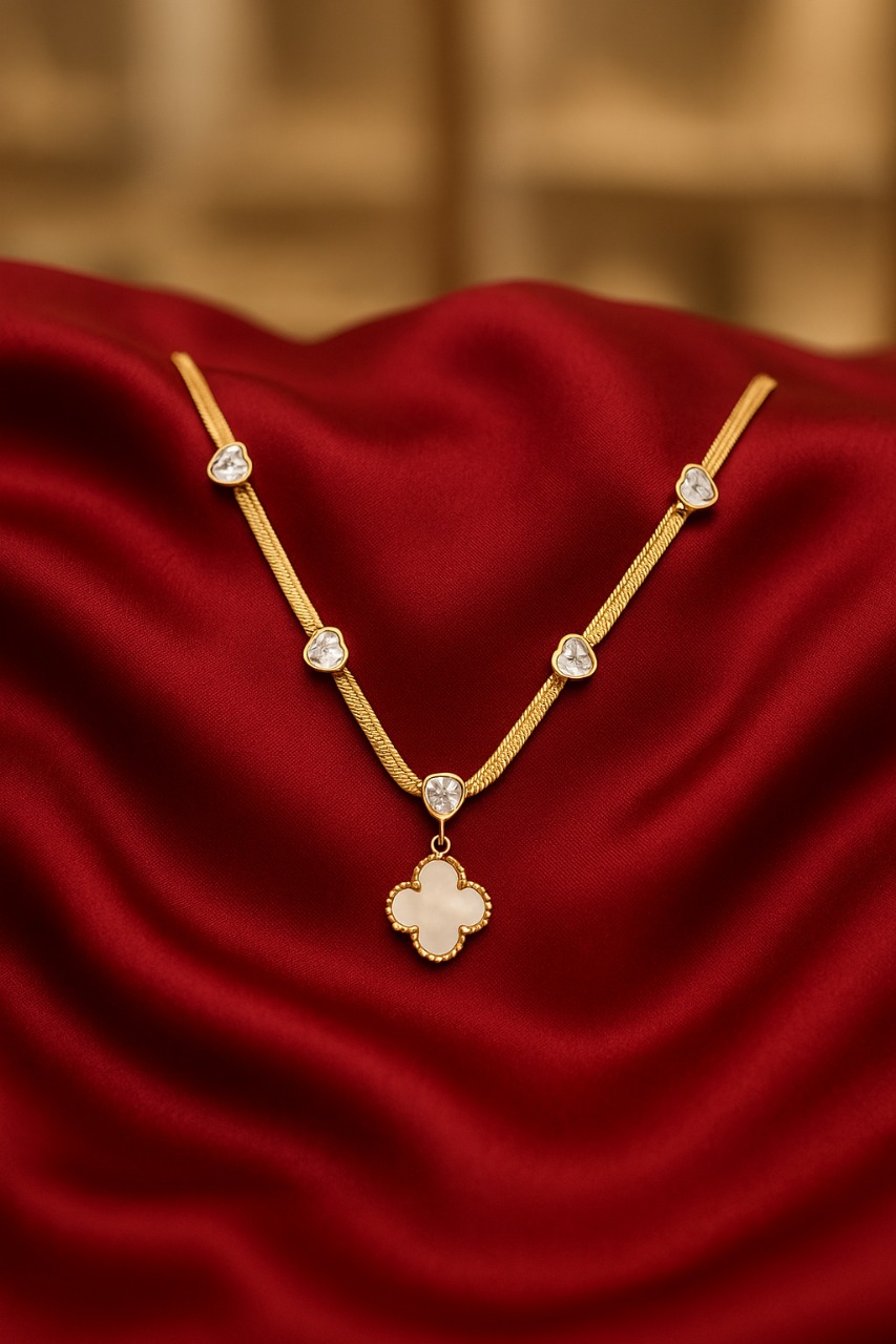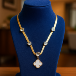 At the centerpiece of this exquisite designer gold-plated necklace, the clover pendant immediately draws attention. The four-leaf clover design, inspired by iconic luxury motifs, symbolizes luck, prosperity, beauty, and grace. With its smooth, polished mother-of-pearl center encased in a delicate gold border, the pendant stands as a statement symbol of classic femininity and luxury charm. This type of clover pendant necklace, also popularly known as a lucky charm necklace or mother-of-pearl clover jewelry, is trending massively across luxury fashion and premium accessory segments.