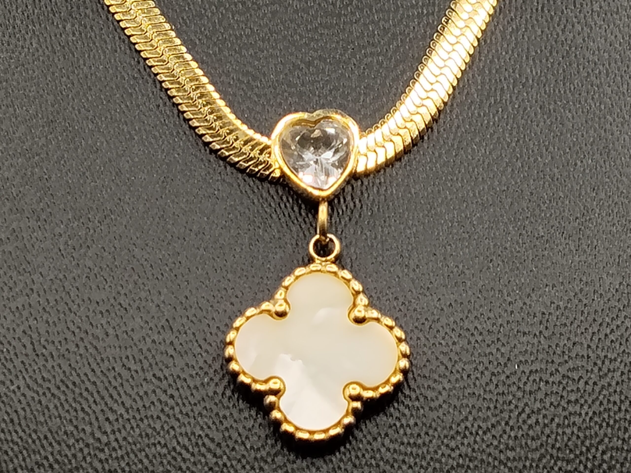 The craftsmanship is further highlighted by the balanced spacing of the heart CZ charms, ensuring symmetry and visual flow. Each stone is cut to reflect maximum brilliance, mimicking the sparkle of diamonds. This makes the necklace an affordable yet luxurious alternative to fine jewelry. The mother-of-pearl clover pendant, with its smooth sheen and natural iridescence, enhances the necklace’s premium look, aligning well with global trends in pearl jewelry, minimalist charm necklaces, and geometric pendant designs.