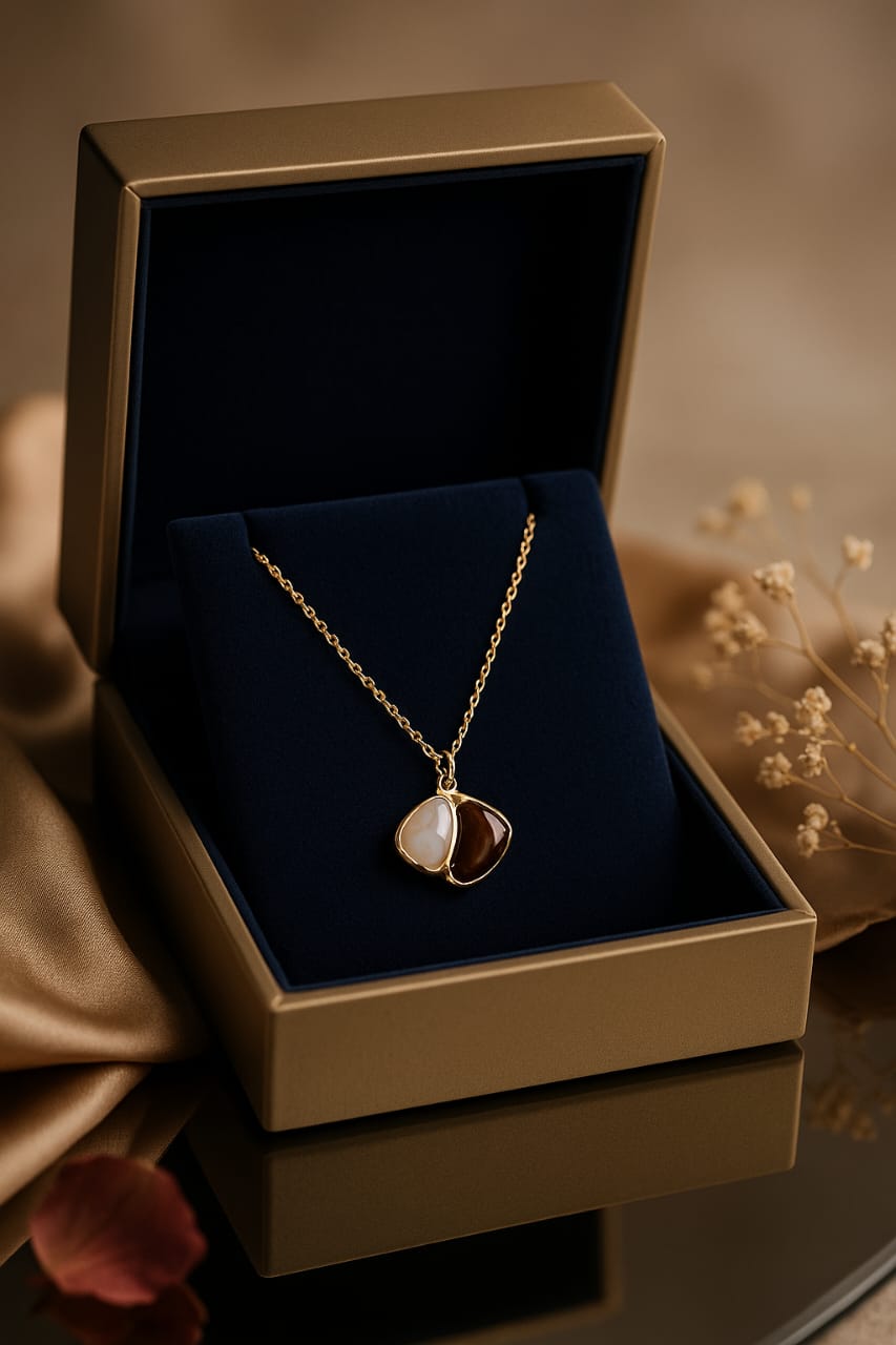 The pendant is finished in a rich gold plating with an anti-tarnish protective coating for long-lasting shine and low maintenance. The bezel edges are gently rounded, giving the pendant a soft, tactile feel. The two pebble shapes nestle together inside a fluid, diamond-like outline, creating a balanced asymmetry that catches light from every angle. Smooth, glossy resin or enamel inserts (ivory and burgundy) deliver a jewel-like depth without the weight of natural stones.