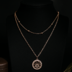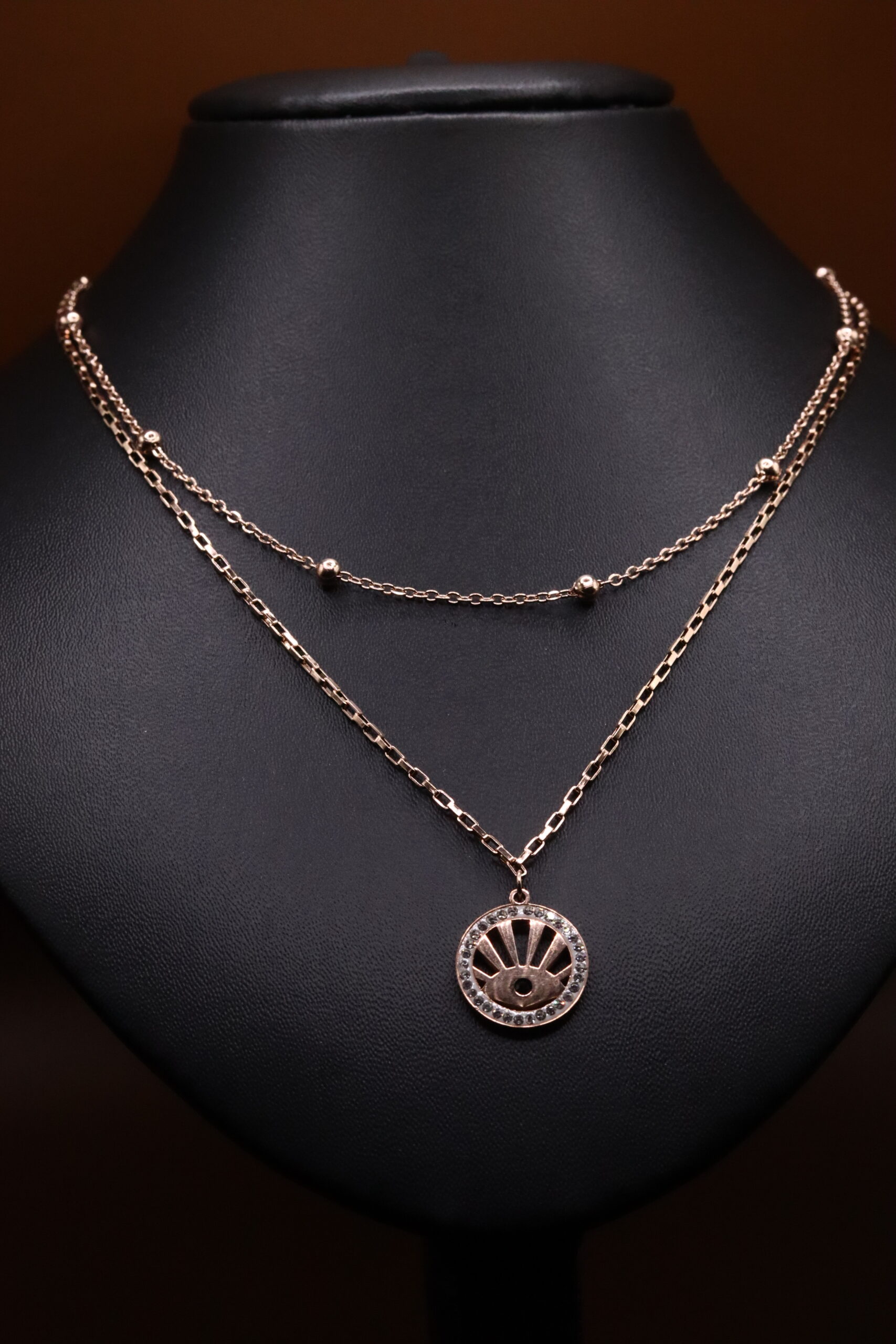 The tone of metal appears to be a soft rose gold plating, which is currently one of the most sought-after aesthetic choices across social platforms and trending jewelry searches. Rose gold is beloved for its universal compatibility across skin tones, timeless luxury feel, and ability to pair beautifully with warm, neutral, and pastel outfits. This aligns with keywords like “rose gold layered necklace,” “modern rose gold jewelry,” “dainty rose gold chains,” and “rose gold pendant for women.”