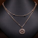 Suspended from the lower chain is the focal point: a round medallion pendant enriched with symbolic and ornamental detailing. At the center of the pendant is a radiating fan-like motif crafted in polished metal, giving the impression of a rising sun, divine protection symbol, or artistic abstract pattern—adding meaning, personality, and sophistication to the necklace. Around the outer frame of the medallion lies a border of delicately set stones, which appear to be clear zircon or crystal accents, adding a sparkling halo effect. This style ties in with trending long-tail keywords such as “crystal halo pendant necklace,” “sunburst medallion charm,” “statement yet minimalist jewelry,” “delicate pendant necklace for gifting,” and “boho chic medallion necklace.”