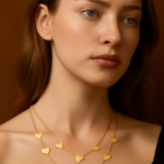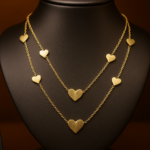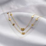 The image showcases a luxurious double-layered anti-tarnish heart necklace crafted for modern women who love minimal yet elegant jewellery. This delicate gold-toned layered chain necklace features smooth, polished heart charms evenly spaced across both layers, creating a romantic and timeless silhouette. The necklace displays a refined minimalist aesthetic, making it perfect for everyday wear as well as special occasions.