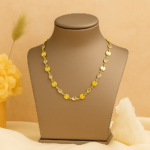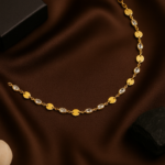 This exquisite anti-tarnish gold-plated necklace is a refined blend of elegance, minimalism, and everyday luxury, designed for women who appreciate subtle yet sophisticated jewellery. The necklace features a delicate chain adorned with alternating tear-drop shaped crystal stones and high-polish round metal discs, creating a rhythmic pattern that beautifully catches the light from every angle. Each tear-drop crystal charm is bezel-set, ensuring maximum shine and a premium finish, while the smooth disc elements add a modern, chic appeal—making it ideal for both daily wear and special occasions.
