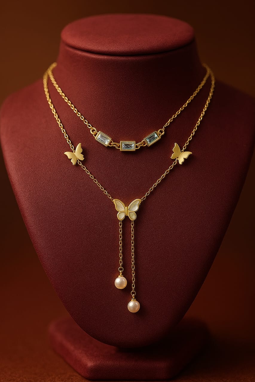 Anti-tarnish rose gold necklace Dainty butterfly lariat design Double-chain layered choker Minimalist...