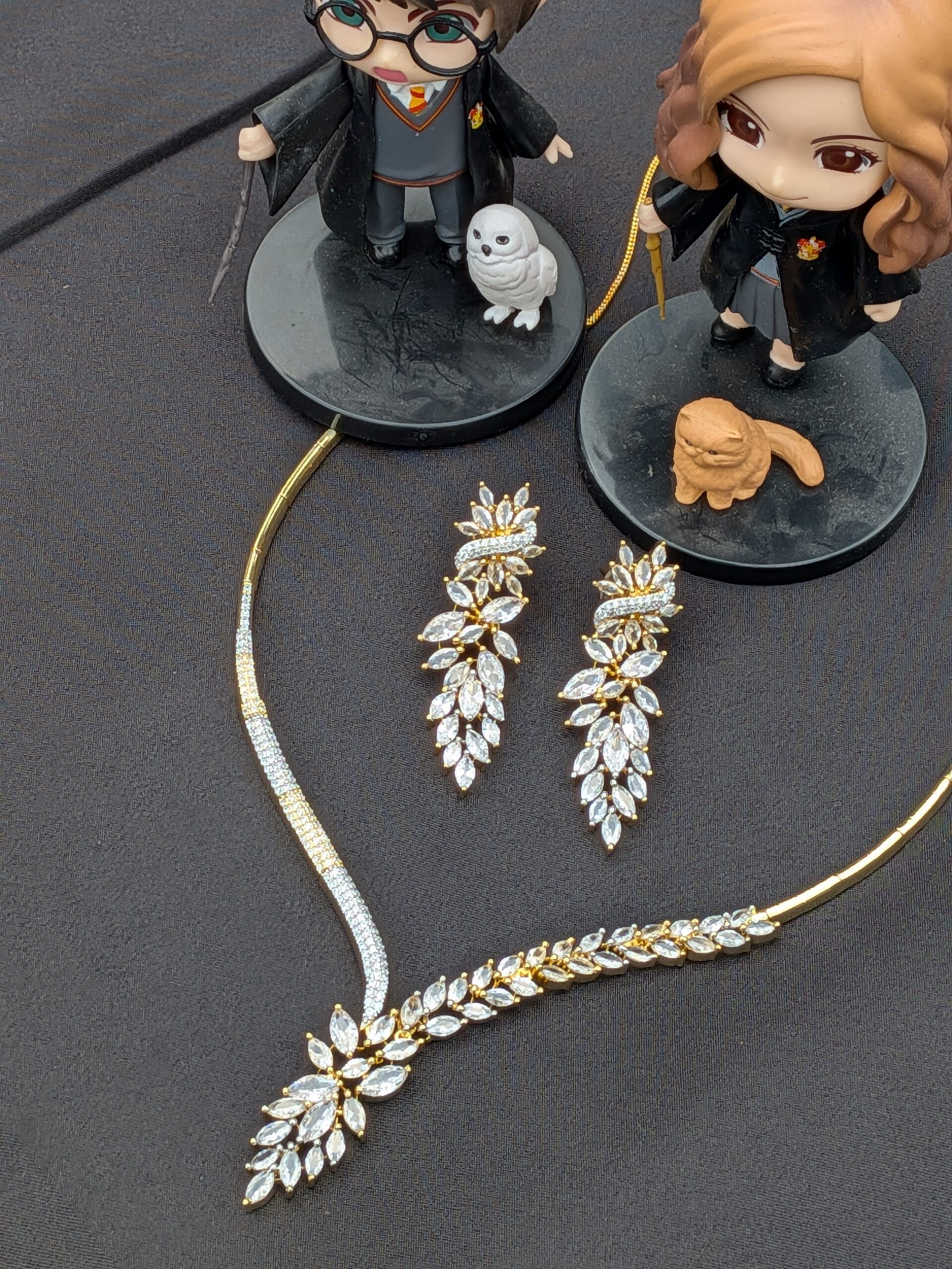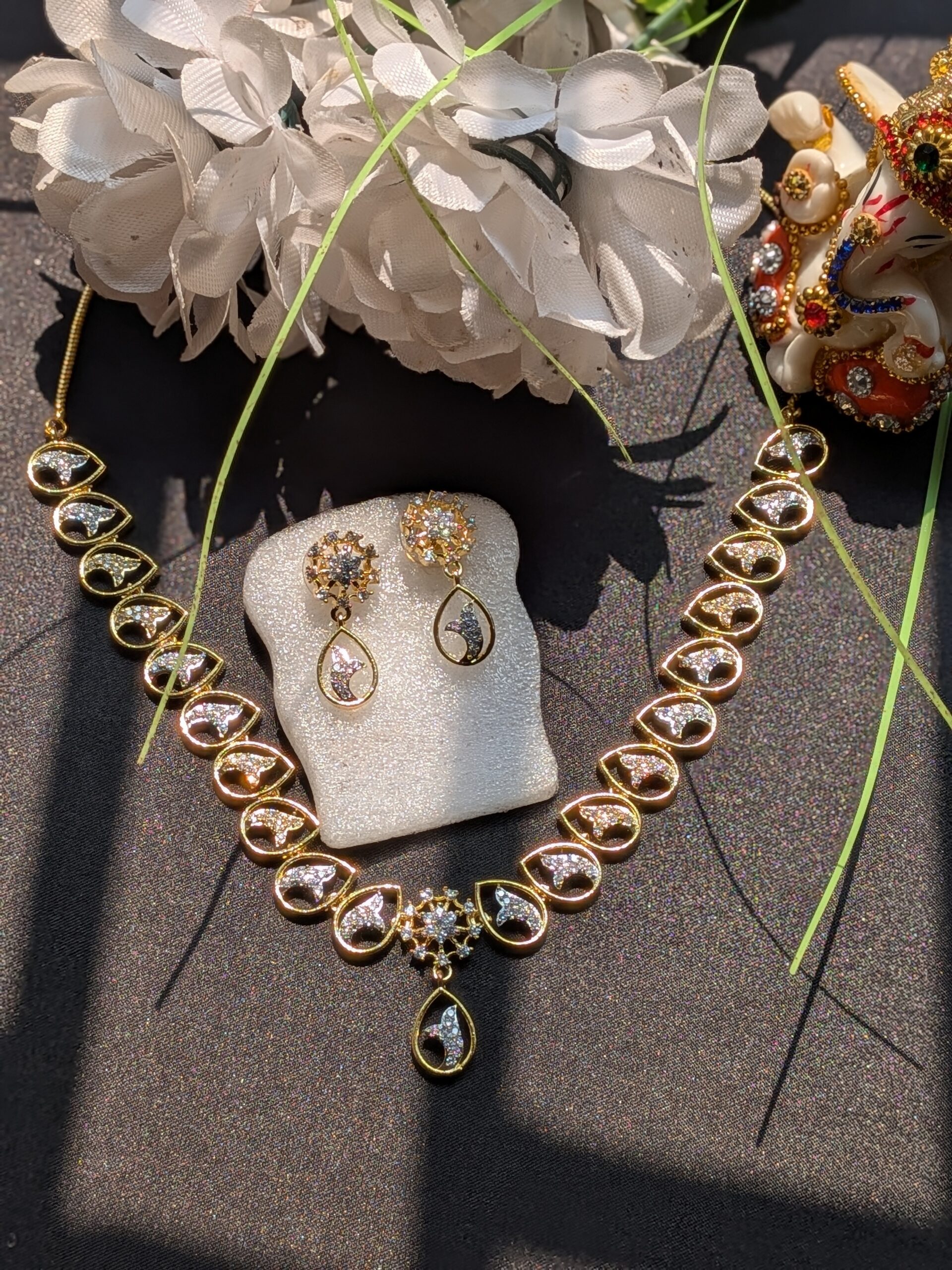Shop Anoira gold plated American Diamond necklace set for women. Elegant CZ teardrop necklace with earrings—perfect for wedding, party & festive wear.