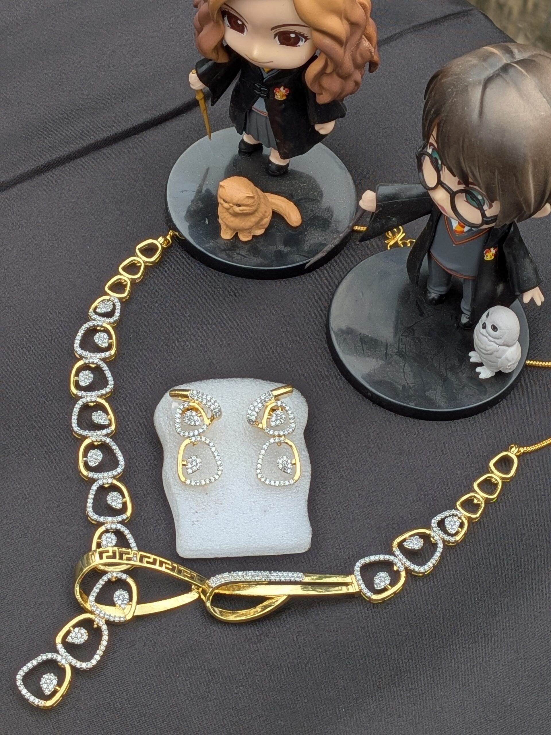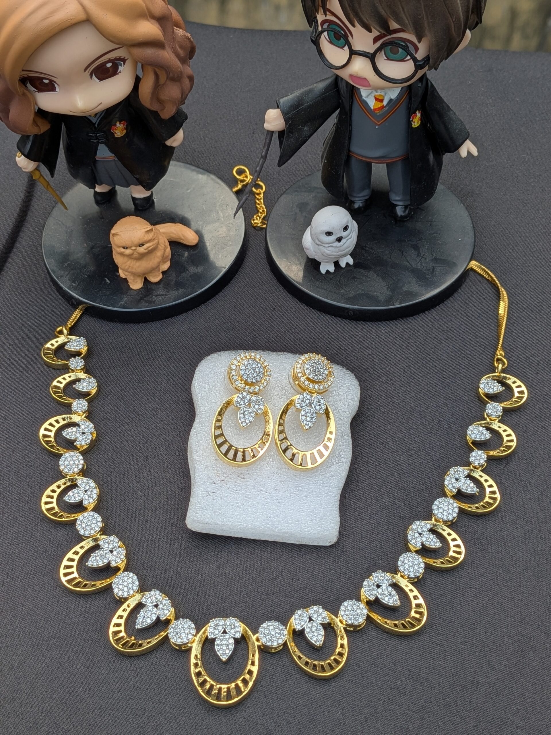 Shop Anoira gold toned American diamond necklace set with CZ stones, oval link design & earrings. Perfect...