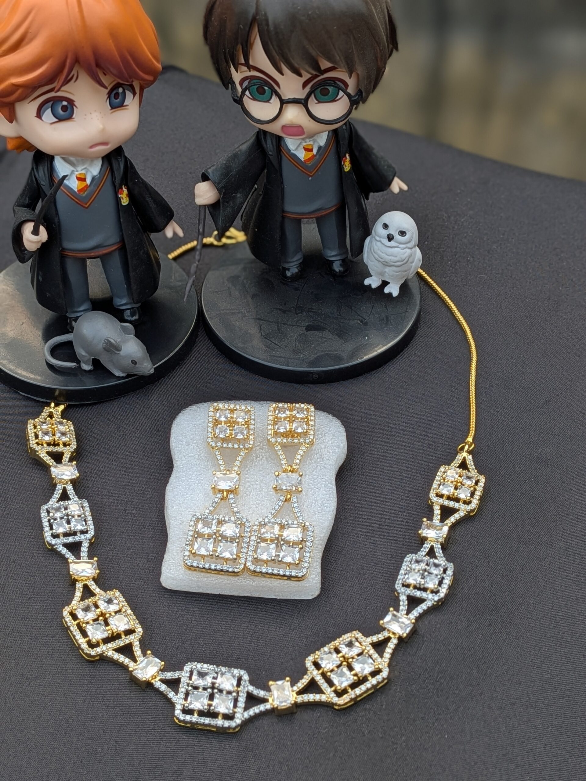 Shop Anoira dual tone American Diamond necklace set for women. Gold & silver CZ geometric necklace with earrings—perfect for party, wedding & festive wear.
