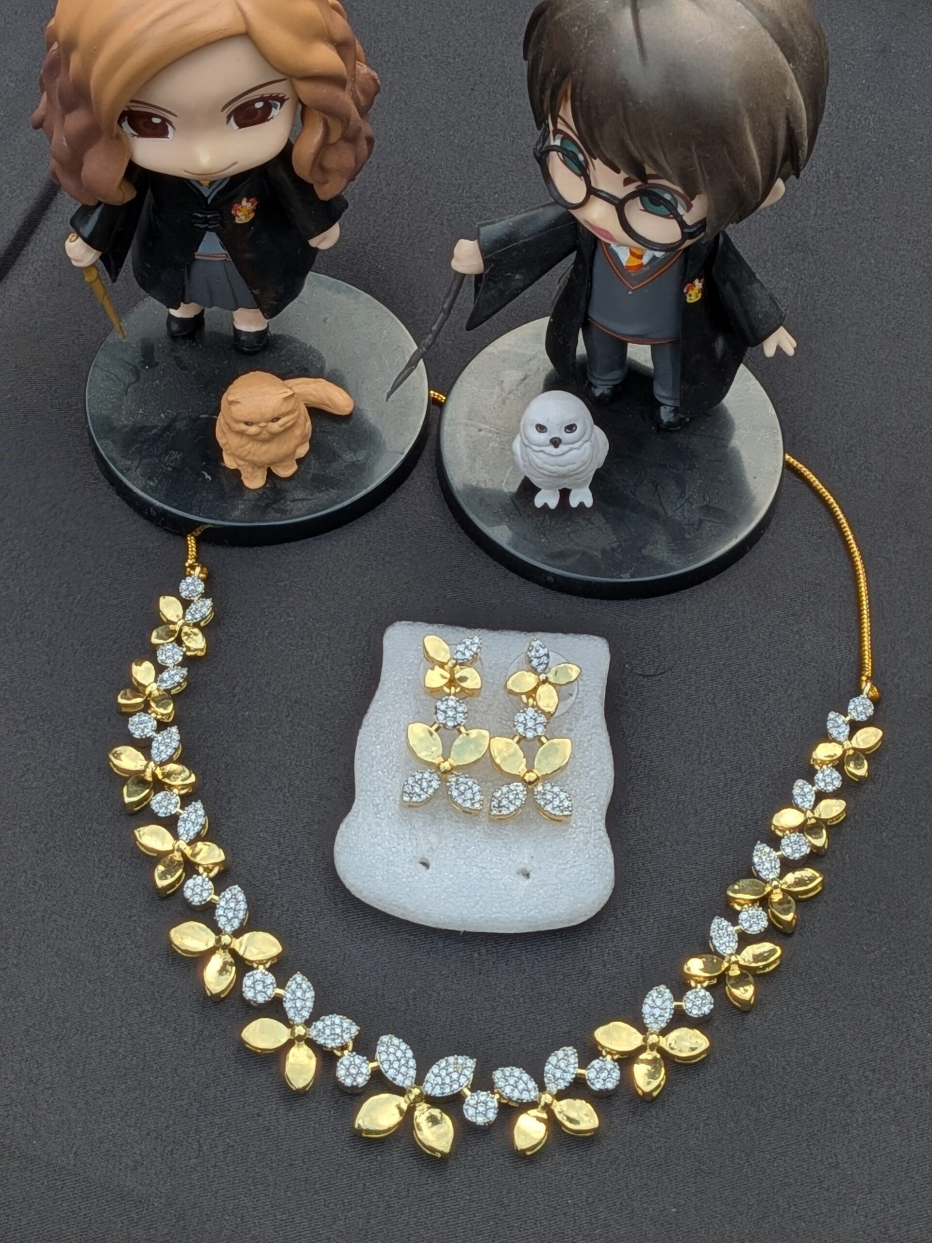 Shop Anoira gold plated American Diamond necklace set for women. Floral CZ leaf design necklace with earrings—perfect for party, wedding & festive wear.