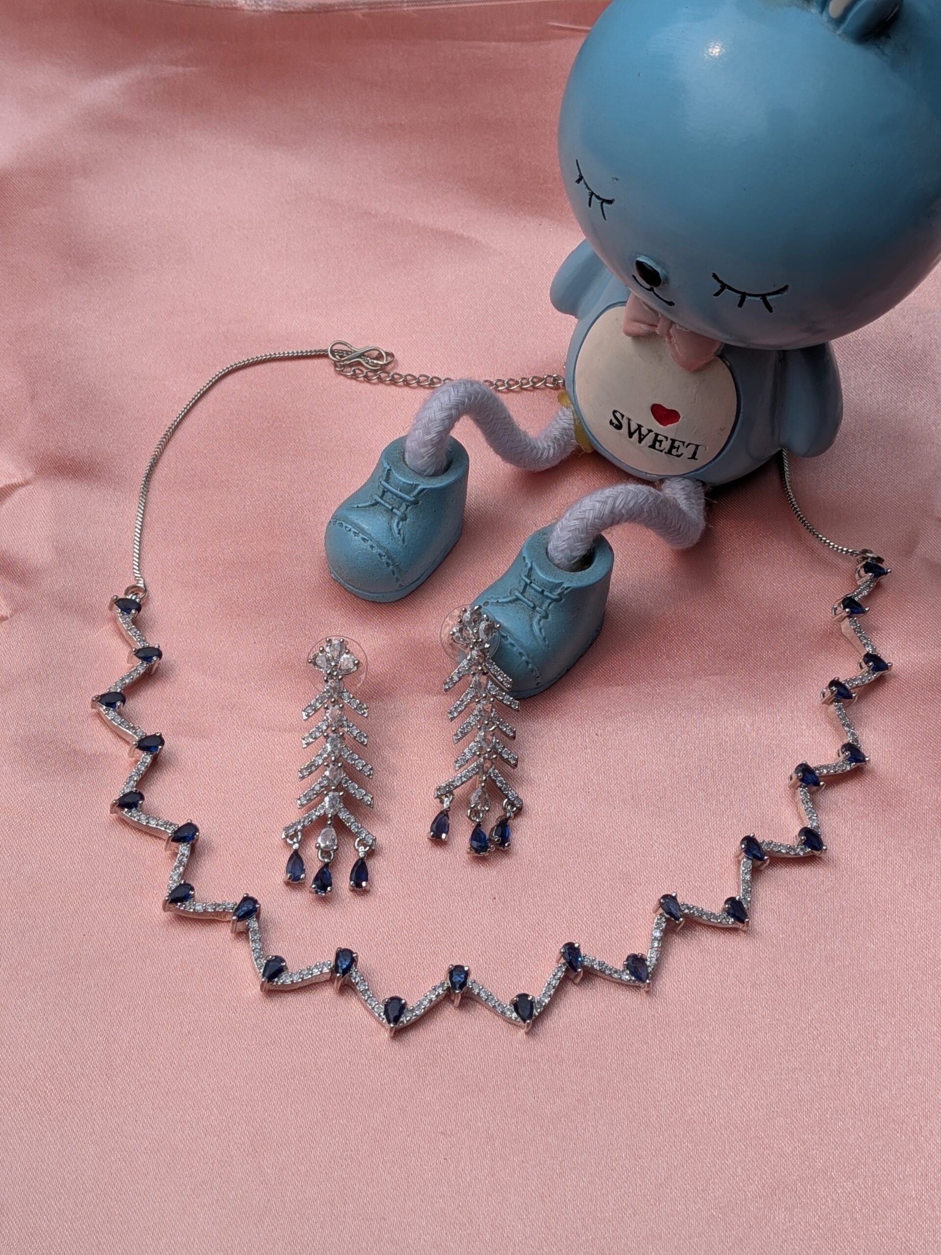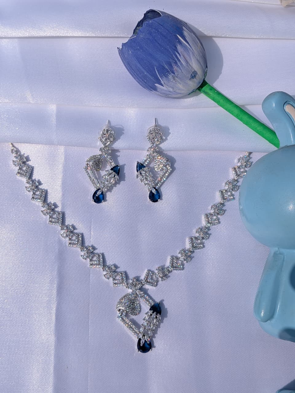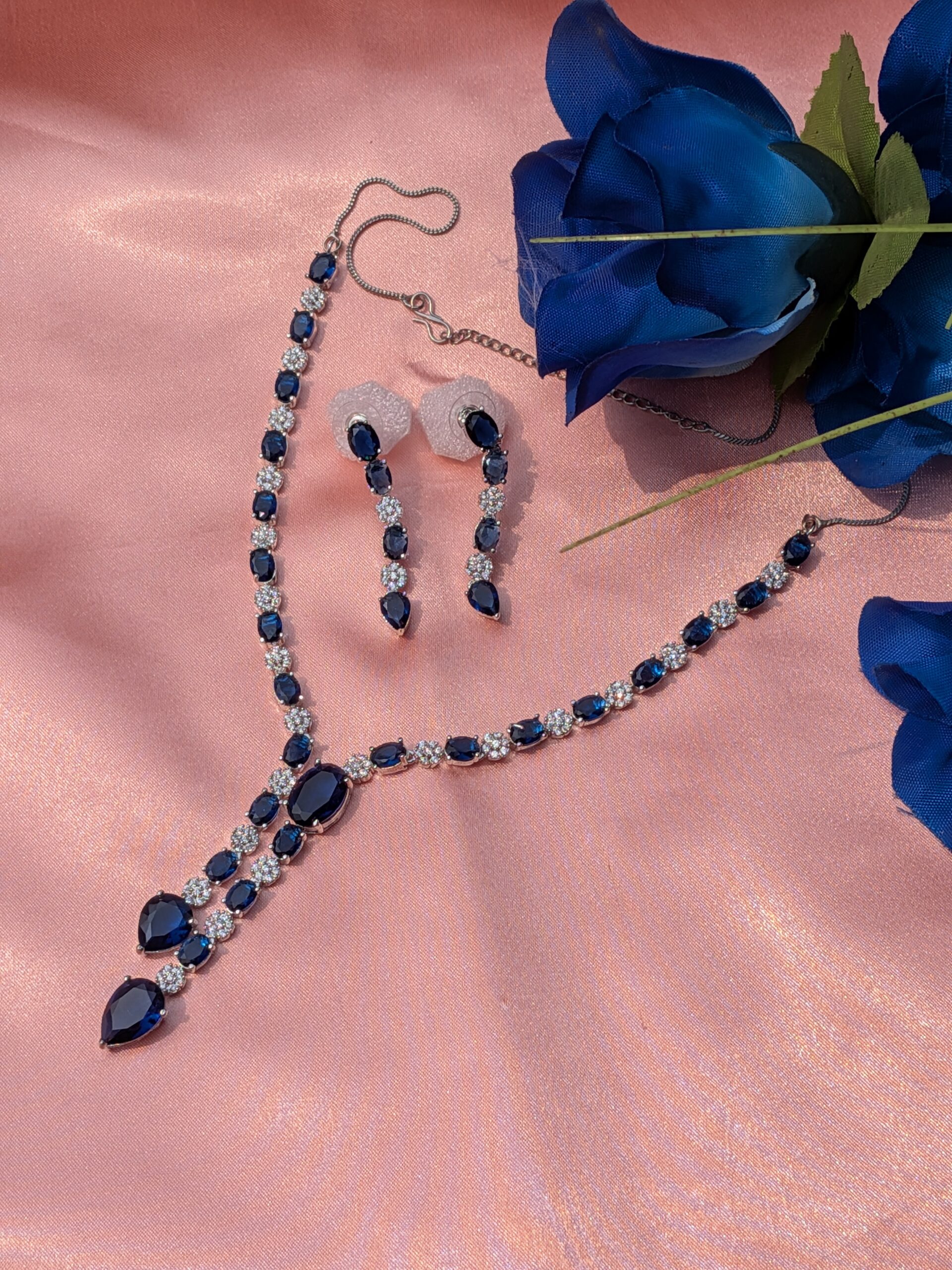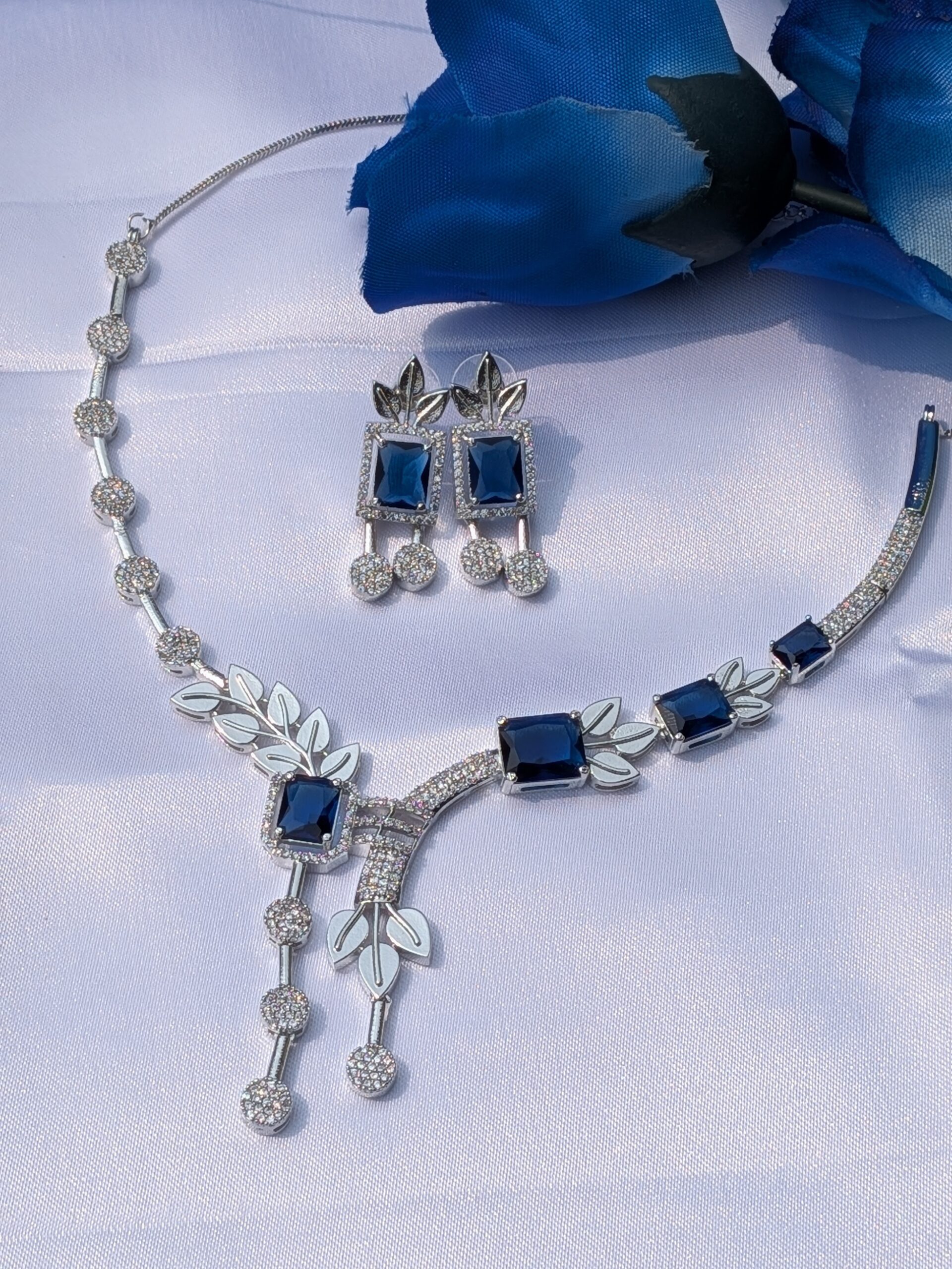 Shop Anoira American Diamond Necklace Set with blue teardrop stones, silver plated CZ geometric statement jewelry set for women, perfect for weddings & parties.