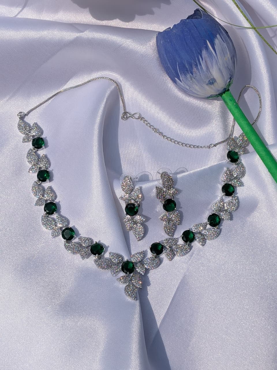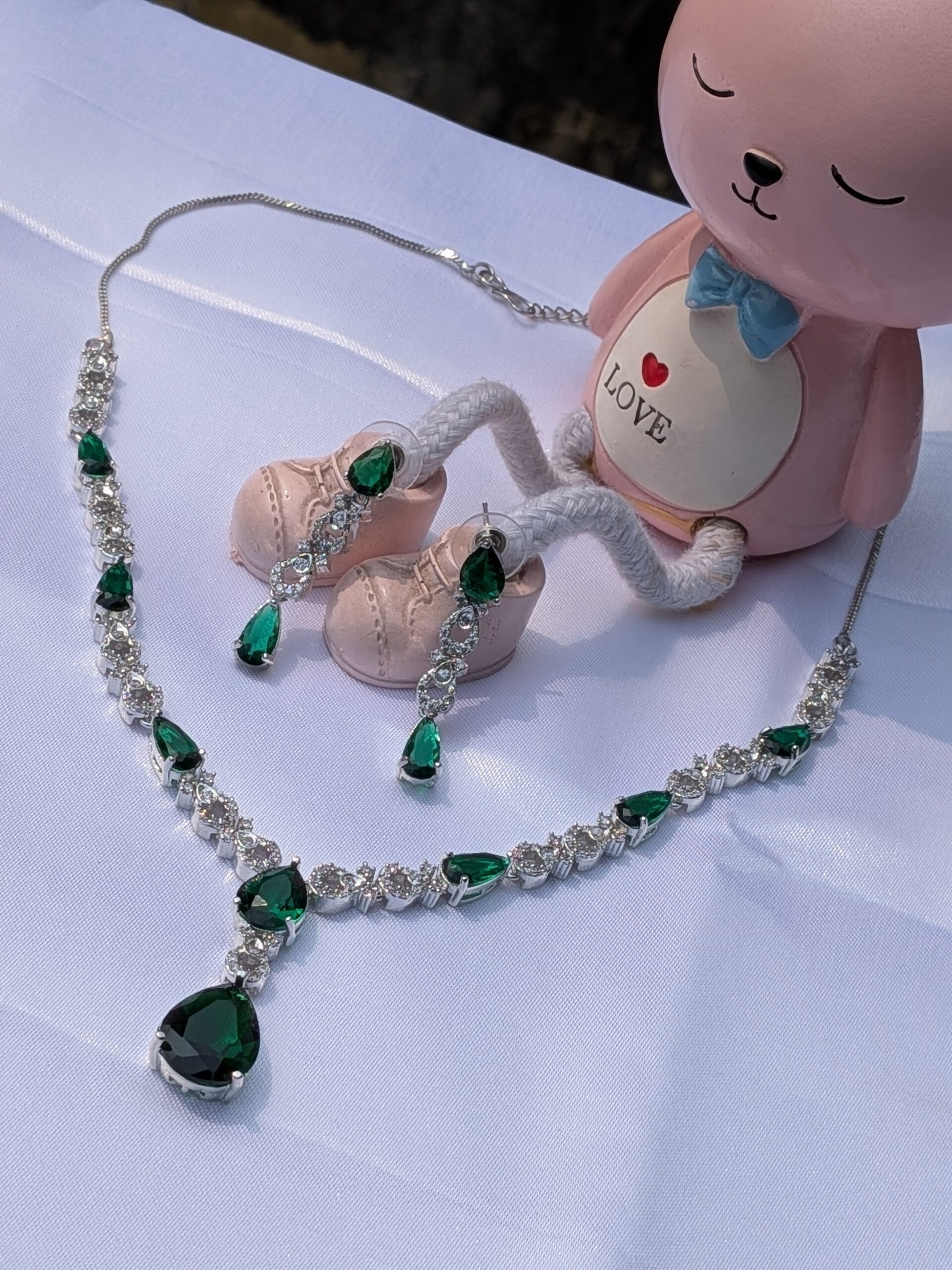Shop Anoira emerald green American diamond necklace set for women with silver tone, teardrop pendant...