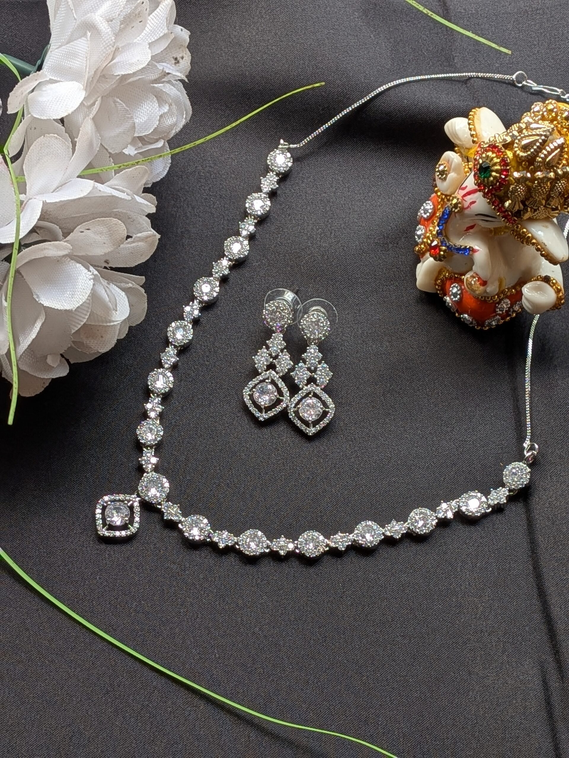 Shop Anoira American Diamond Necklace Set for women. Elegant CZ diamond tennis necklace with earrings, silver finish—perfect for party, wedding & daily wear.