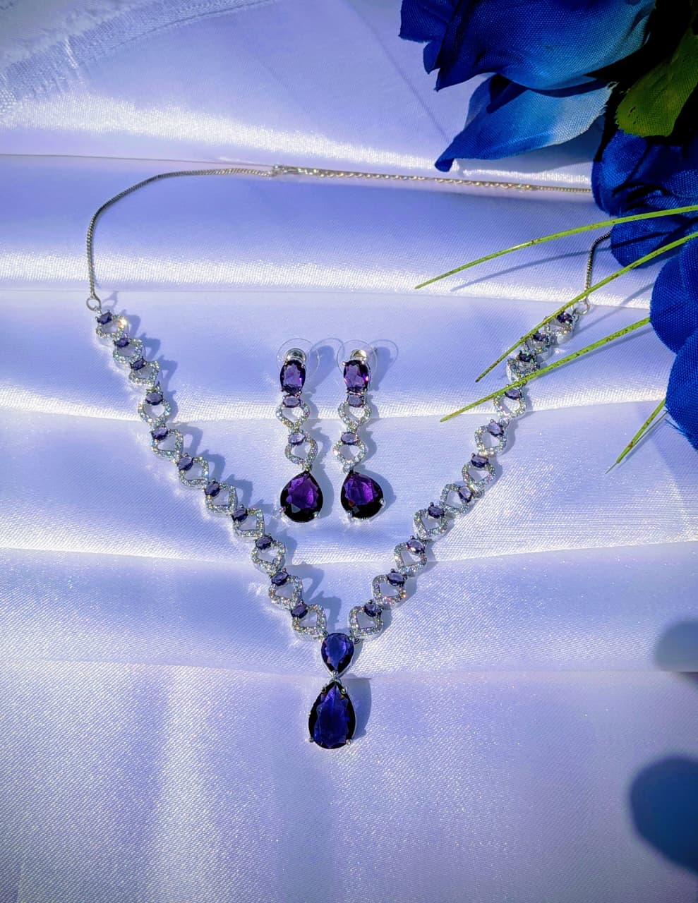 Shop Anoira American Diamond Necklace Set with blue teardrop stones, silver plated CZ jewelry set for women, perfect for party wear, weddings & festive looks.