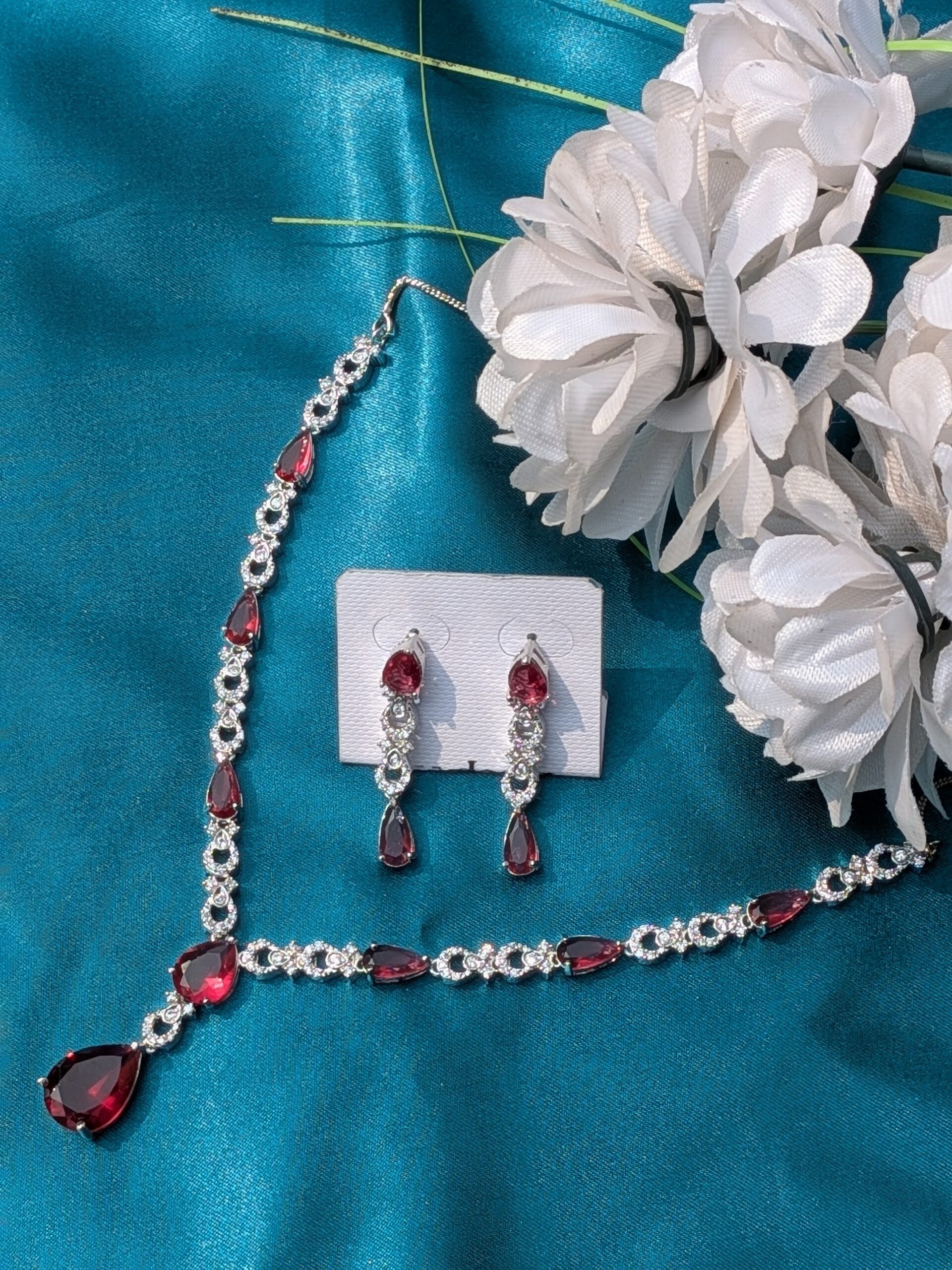 Shop Anoira ruby red American diamond necklace set for women with silver tone, teardrop pendant & earrings....